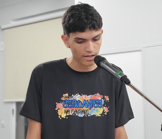 Na oportunidade, Rebeca Calderon Menezes, do 3º ano, e Henderson Souza Ferrado, do 2º, utilizaram a tribuna da Câmara e falaram em nome dos estudantes. Informaram a participação no projeto "Estudante no Controle", que tem como objetivo desenvolver o protagonismo juvenil e a cidadania ativa, envolvendo os alunos na identificação de problemas reais e na busca de soluções concretas para a escola e seu entorno.